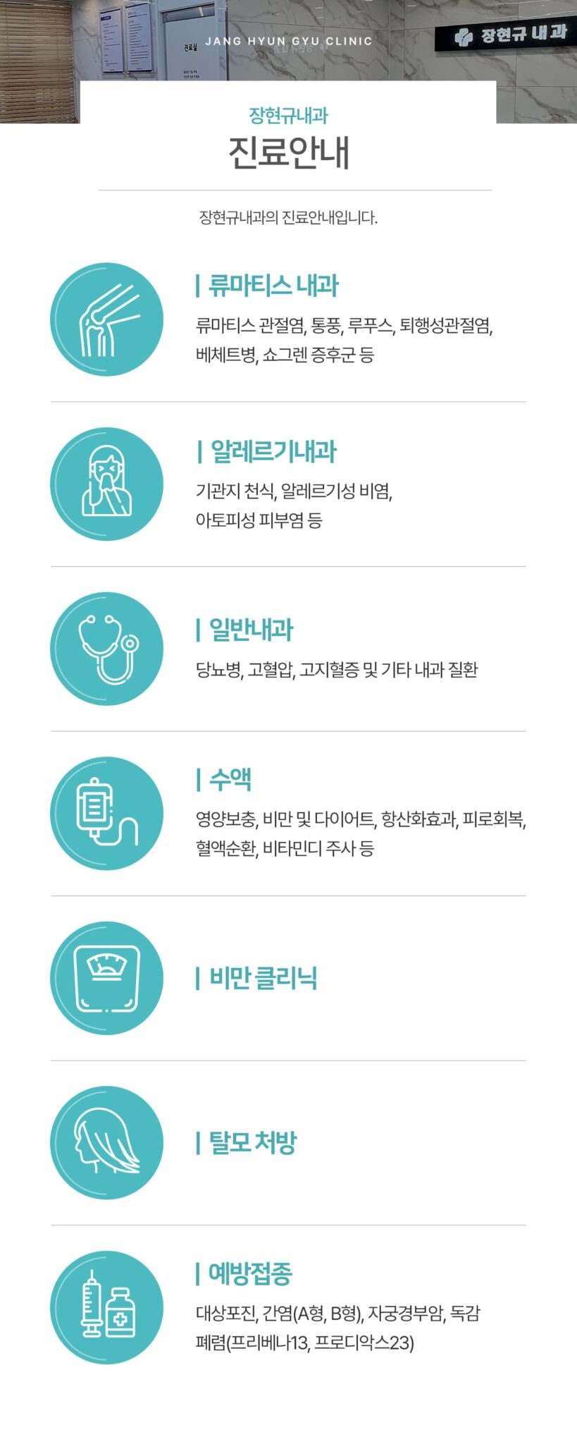 장현규내과의원항상 진심을 다하는 장현규내과 입니다. 전화 진료안내 오시는길 장현규내과의원 항상 진심을 다하는 장현규내과 입니다. 소개 오시는길 장현규 내과 강남구 도곡동 420-16 테라빌딩 2층 지도에서 보기 오시는길 지하철 3호선 매봉역 4번 출구에서 도보로 300m (3호선 강남 고속터미널역에서 4번째 역임)서울 강남구 도곡동 420-16 테라빌딩 주차장 (약간 협소한 편임)서울 강남구 도곡동 417-8 도곡주차장 (유료주차장: 1시간까지 주차비 지원) 진료시간 월/화/목/금 : 오전 9시 20분~ 오후 6시 (점심시간 : 오후 1시~2시 20분)수/토 : 오전 9시 20분 ~ 오후 1시일요일/공휴일 : 휴진 전화번호 02-577-1750 사업자정보 상호명 : 장현규내과의원대표자 : 장현규사업자번호 : 607-96-17488 입금계좌 예금주 :입금은행 : 계좌번호 : 전화문의 오시는길 인사말씀 홍성미소치과의원 의료진 소개 홍성미소치과의원 의료진 오시는길 홍성미소치과의원 위치 안내